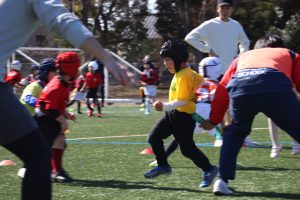 初めて会うお友達ともすぐに打ち解け、一緒に走り回る姿はラグビーらしい交流の